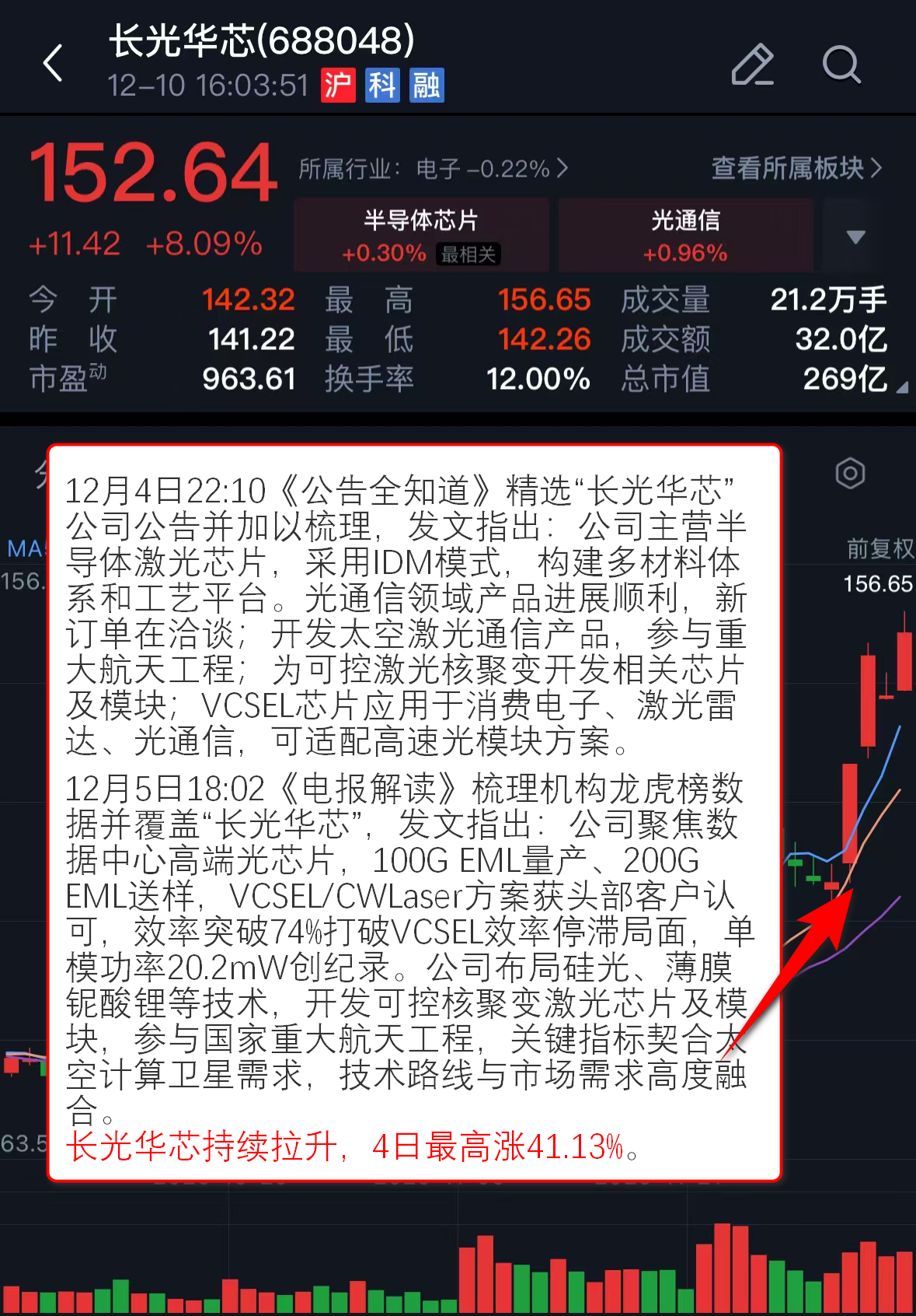 12月5日18:02《电报解读》梳理机构龙虎榜数据并覆盖“长光华芯”,发文指出:公司聚焦数据中心高端光芯片,100G EML量产、200G EML送样,VCSEL/CWLaser方案获头部客户认可,效率突破74%打破VCSEL效率停滞局面,单模功率20.2mW创纪录。公司布局硅光、薄膜铌酸锂等技术,开发可控核聚变激光芯片及模块,参与国家重大航天工程,关键指标契合太空计算卫星需求,技术路线与市场需求高度融合。