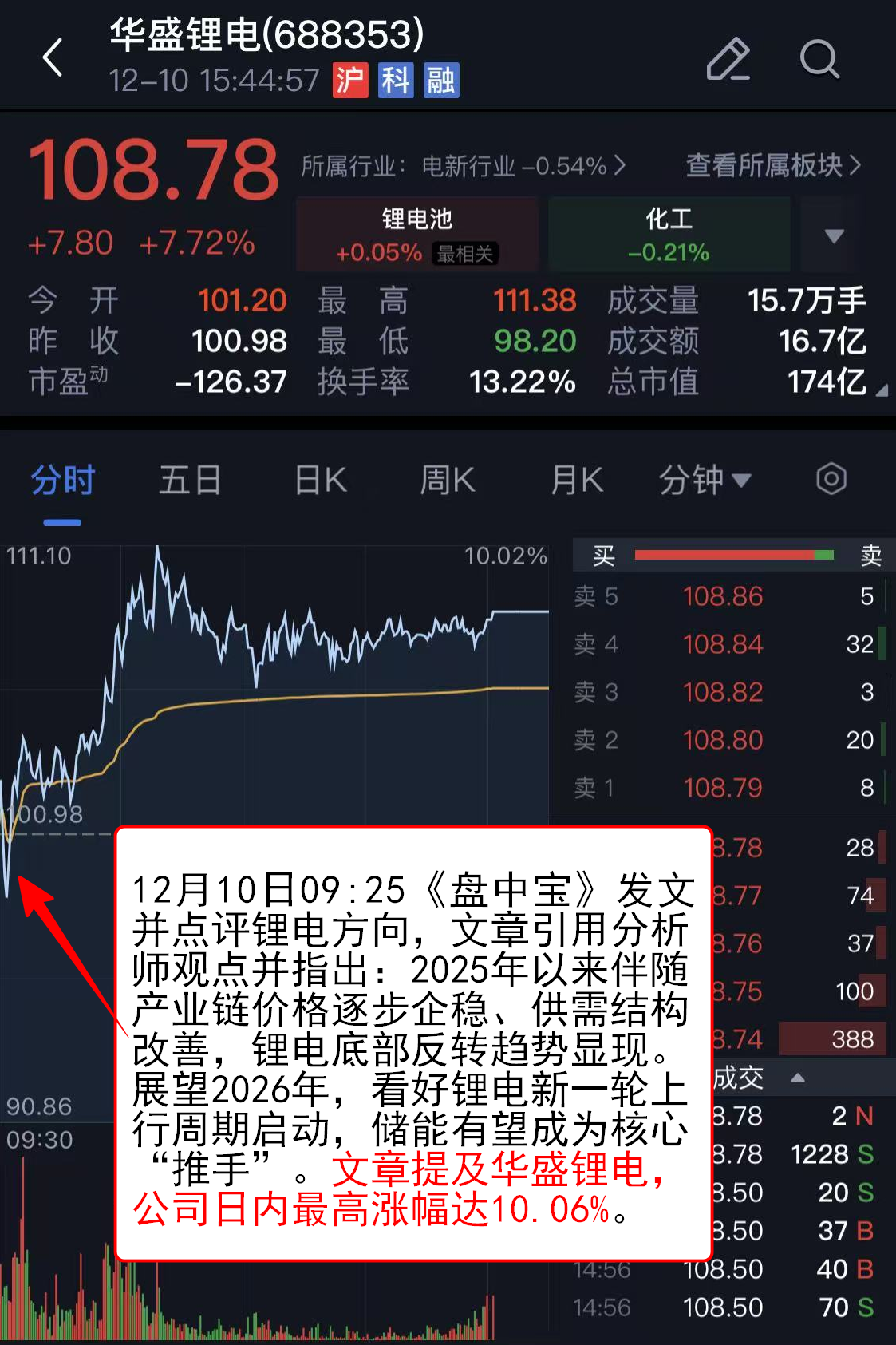 12月10日09:25《盘中宝》发文并点评锂电方向,文章引用分析师观点并指出:2025年以来伴随产业链价格逐步企稳、供需结构改善,锂电底部反转趋势显现。展望2026年,看好锂电新一轮上行周期启动,储能有望成为核心“推手”。文章提及华盛锂电,公司日内最高涨幅达10.06%。