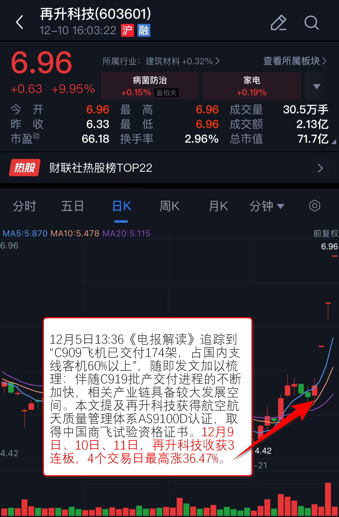 12月5日13:36《电报解读》追踪到“C909飞机已交付174架,占国内支线客机60%以上”,随即发文加以梳理:伴随C919批产交付进程的不断加快,相关产业链具备较大发展空间。本文提及再升科技获得航空航天质量管理体系AS9100D认证,取得中国商飞试验资格证书。12月9日、10日、11日,再升科技收获3连板,4个交易日最高涨36.47%。