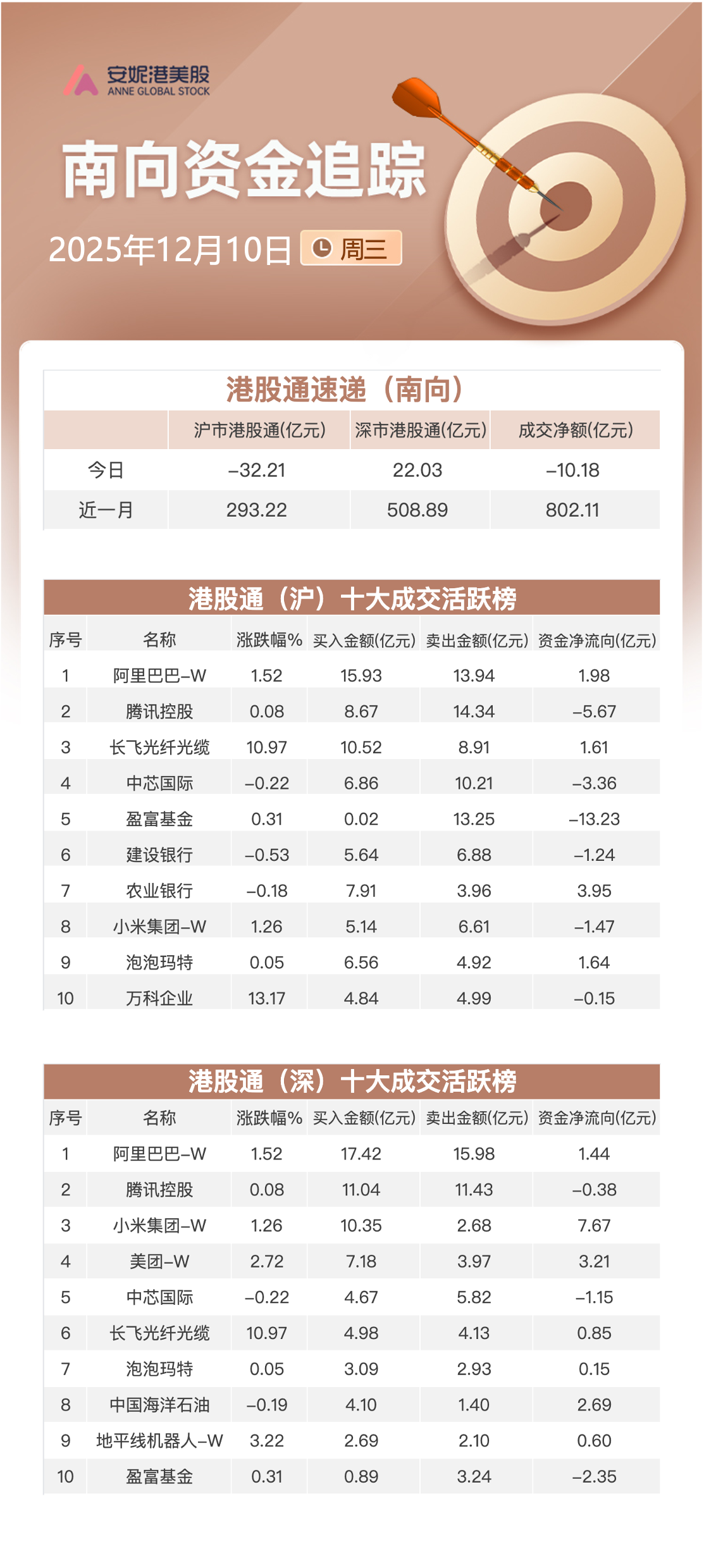 港股今日探底回升,但南向资金净卖出约10.18亿港元。其中,沪港股通净流出约32.21亿港元,深港股通净流入约22.03亿港元。