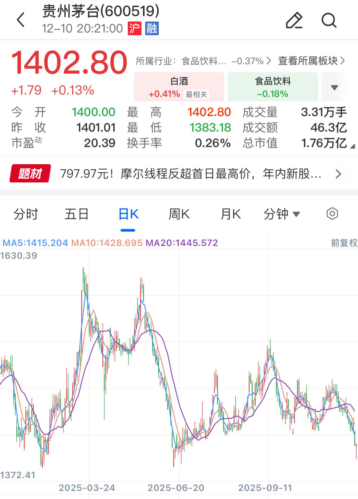 业绩表现不佳,也反应在了两家公司股价上。截至今日收盘,贵州茅台股价险守1400元关口,报1402.8元,总市值为1.76万亿元,今年该股股价累计下跌6.25%。