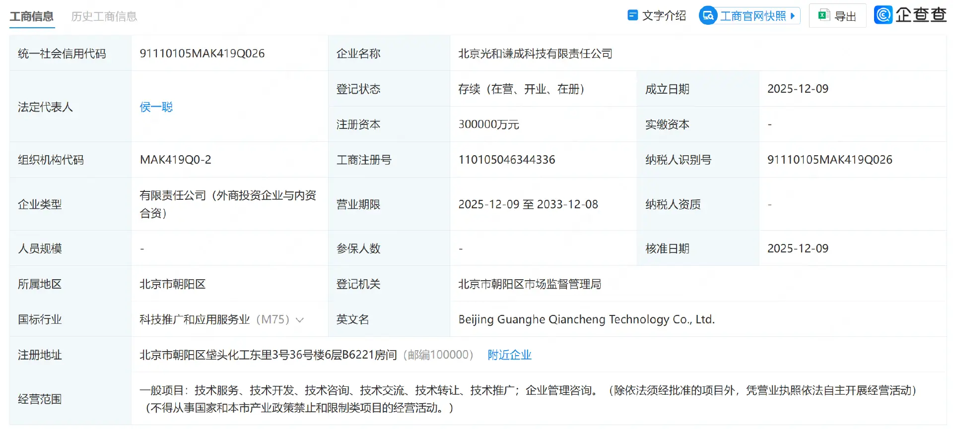 工商信息显示,光和谦成于今年12月9日,法定代表人为侯一聪,注册资本为30亿元。其企业类型为有限责任公司(外商投资企业与内资合资),经营范围为一般项目:技术服务、技术开发、技术咨询、技术交流、技术转让、技术推广;企业管理咨询。