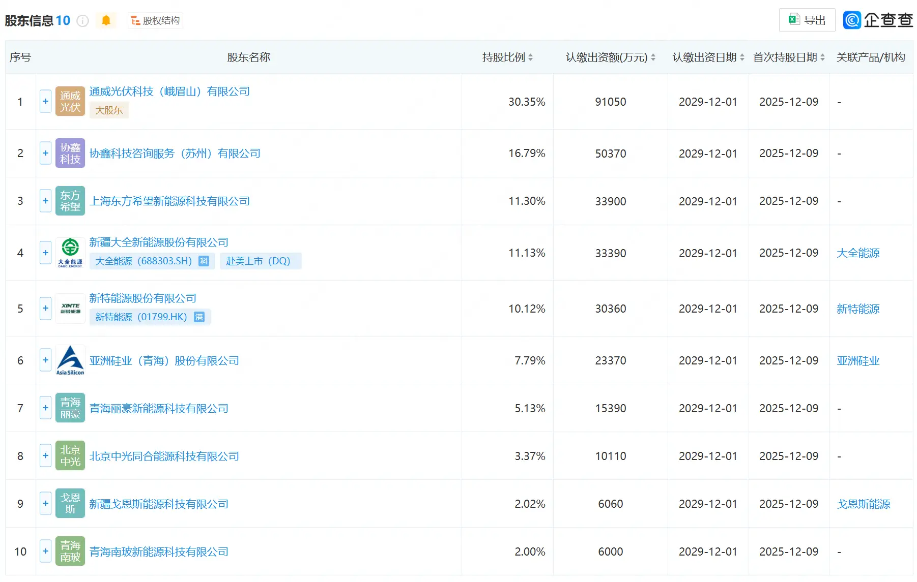 与此同时,其股东方还包括1家由中国光伏行业协会全资控股的北京中光同合能源科技有限公司,持股比例为3.37%,认缴出资额为10110万元。