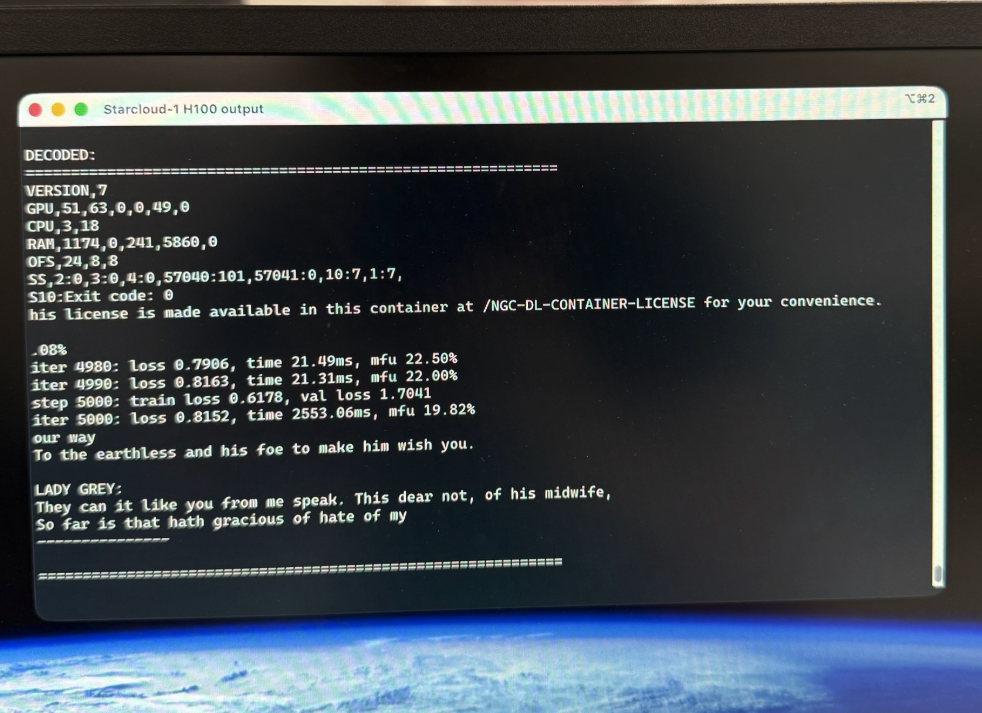 Starcloud还使用莎士比亚全集训练了由OpenAI创始成员Andrej Karpathy打造的LLM NanoGPT,使该模型能够以莎士比亚式的英语进行表达。