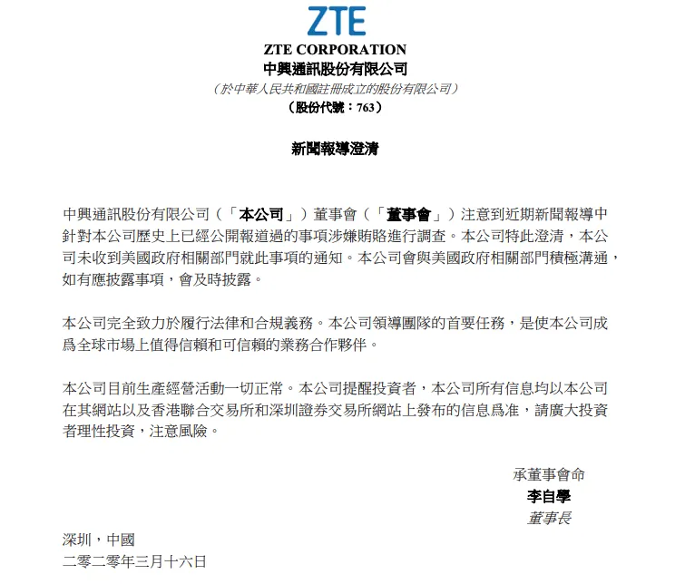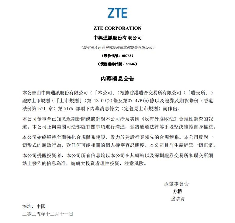 此外,中兴通讯还在公告中表示,公司始终坚持全面强化合规体系建设,致力于建设行业领先的合规体系。公司反对一切形式的腐败行为,对任何可能相关的个人持零容忍态度。公司目前生产经营一切正常。