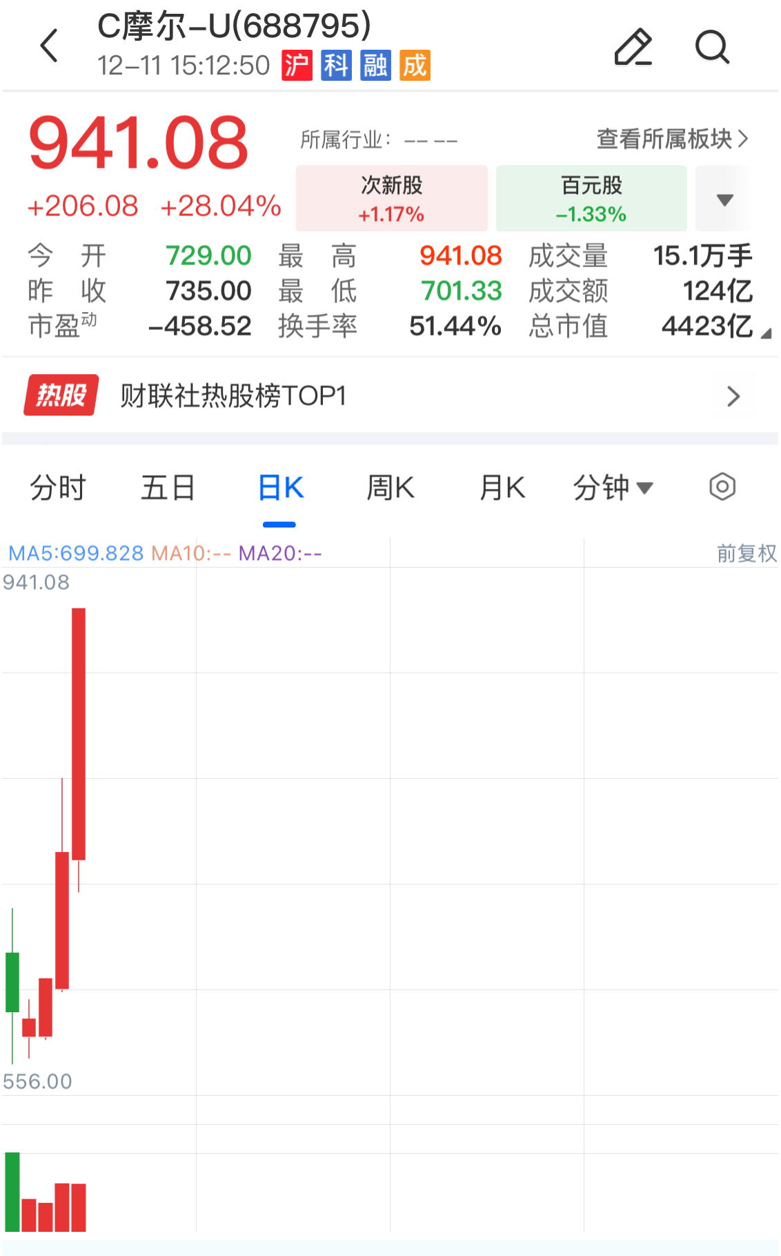 财联社12月11日讯,今日午后,摩尔线程股价进一步走高,截至收盘,单日涨幅达到28.04%,报941.08元/股,创上市以来新高,总市值为4423亿元。对比首发价格114.28元/股,摩尔线程上市5个交易日涨幅达到723.49%。