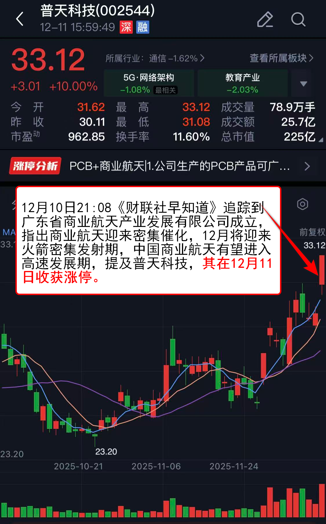 12月10日21:08《财联社早知道》追踪到广东省商业航天产业发展有限公司成立,指出商业航天迎来密集催化,12月将迎来火箭密集发射期,中国商业航天有望进入高速发展期,提及普天科技,其在12月11日收获涨停。