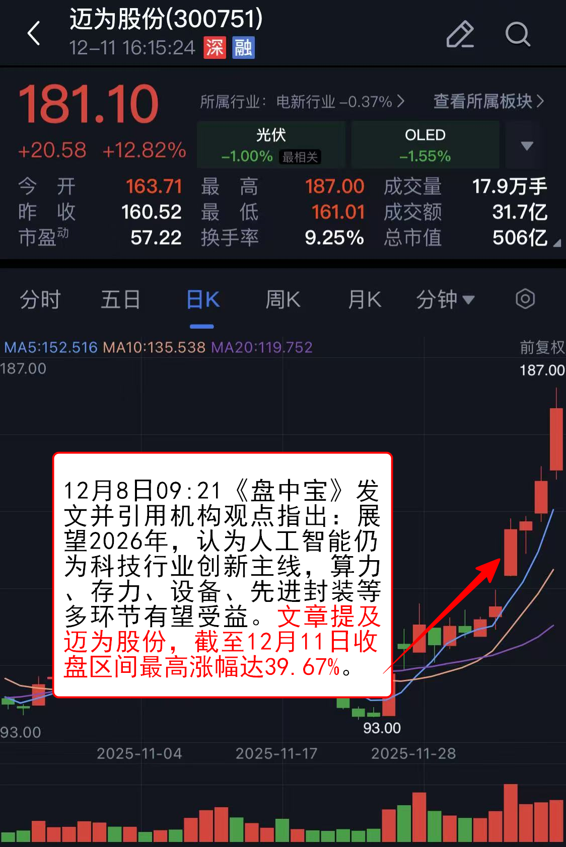 12月8日09:21《盘中宝》发文并引用机构观点指出:展望2026年,认为人工智能仍为科技行业创新主线,算力、存力、设备、先进封装等多环节有望受益。文章提及迈为股份,截至12月11日收盘区间最高涨幅达39.67%。