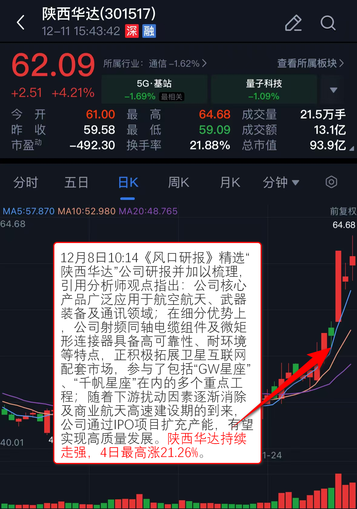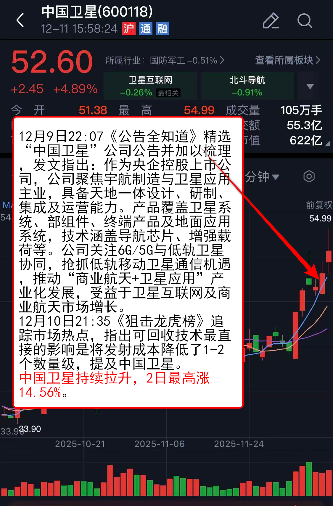 12月10日21:35《狙击龙虎榜》追踪市场热点,指出可回收技术最直接的影响是将发射成本降低了1-2个数量级,提及中国卫星。