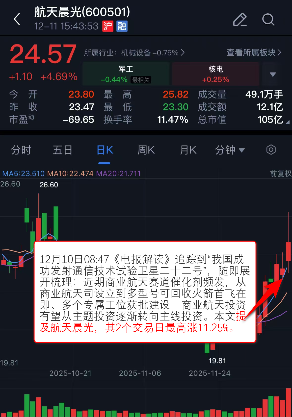 12月10日08:47《电报解读》追踪到“我国成功发射通信技术试验卫星二十二号”,随即展开梳理:近期商业航天赛道催化剂频发,从商业航天司设立到多型号可回收火箭首飞在即、多个专属工位获批建设,商业航天投资有望从主题投资逐渐转向主线投资。本文提及航天晨光,其2个交易日最高涨11.25%。