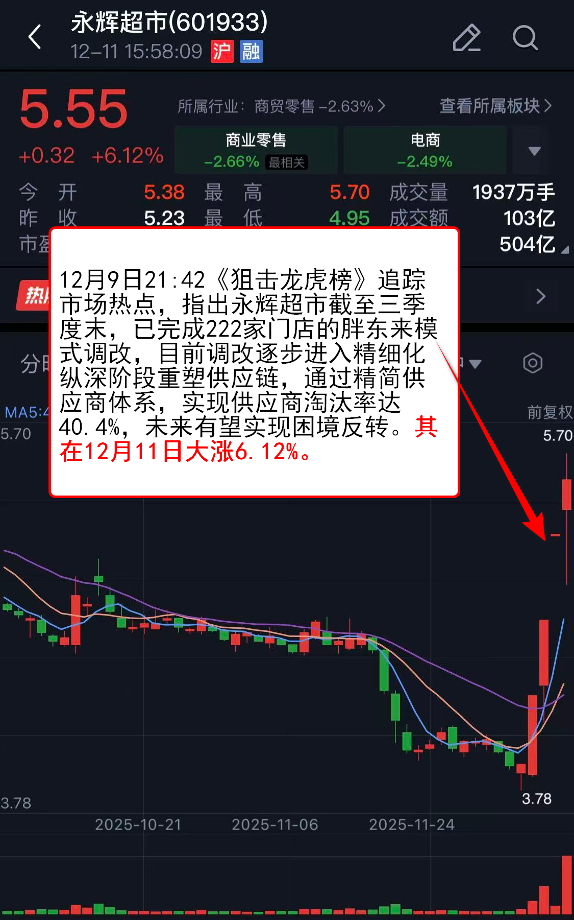 12月9日21:42《狙击龙虎榜》追踪市场热点,指出永辉超市截至三季度末,已完成222家门店的胖东来模式调改,目前调改逐步进入精细化纵深阶段重塑供应链,通过精简供应商体系,实现供应商淘汰率达40.4%,未来有望实现困境反转。其在12月11日大涨6.12%。