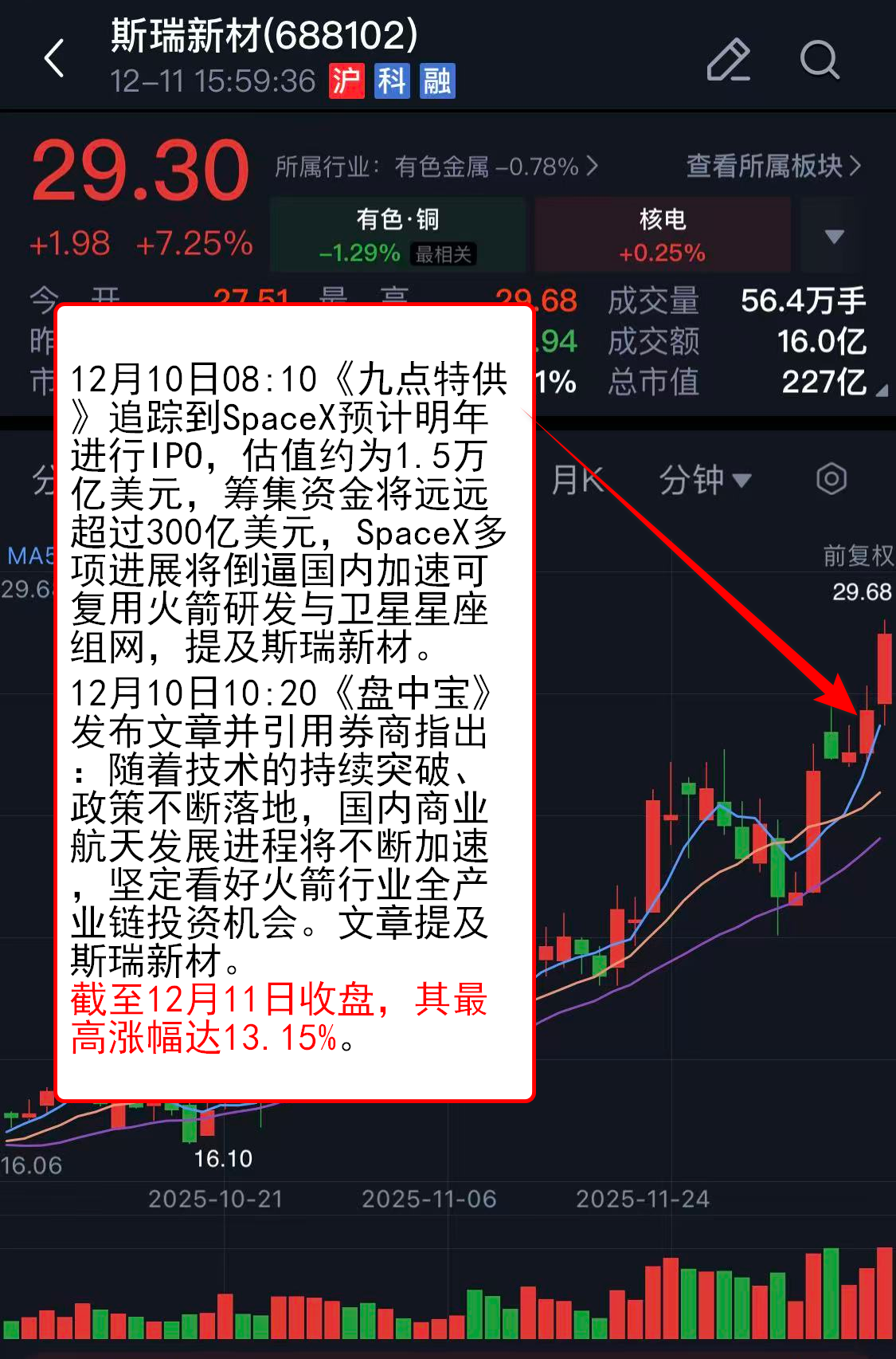 12月10日10:20《盘中宝》发布文章并引用券商指出:随着技术的持续突破、政策不断落地,国内商业航天发展进程将不断加速,坚定看好火箭行业全产业链投资机会。文章提及斯瑞新材。