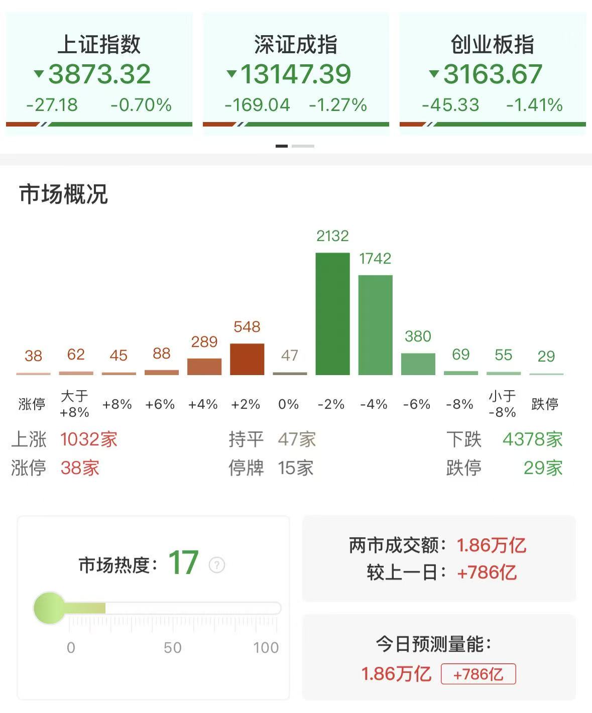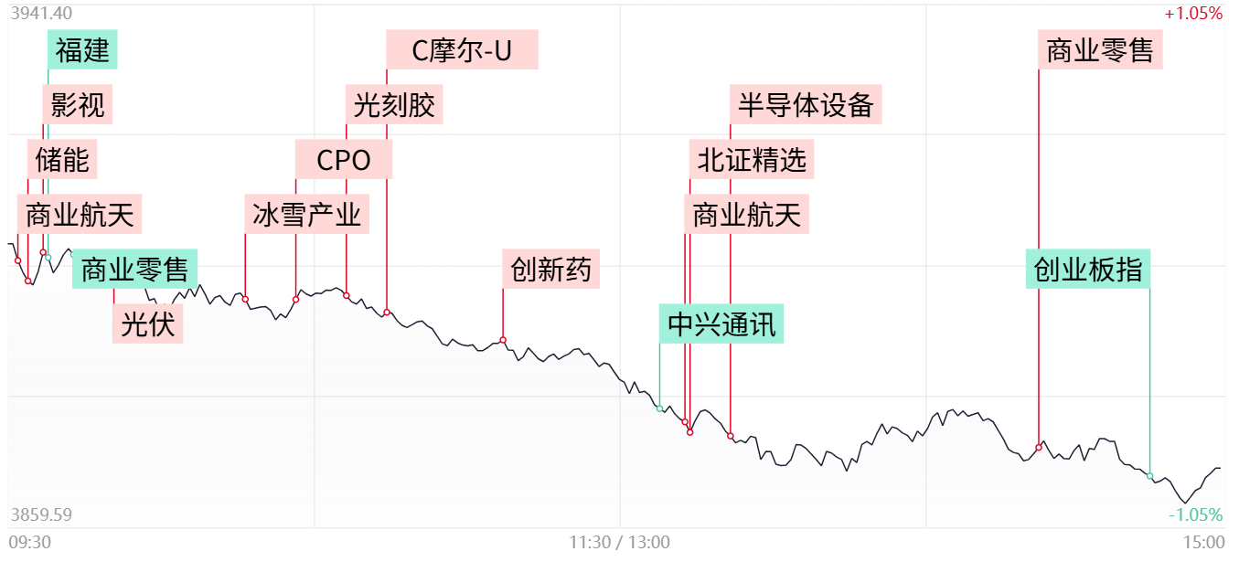 财联社12月11日讯,市场震荡调整,沪指高开低走,创业板指冲高回落,此前一度涨超1%。沪深两市成交额1.86万亿,较上一个交易日放量786亿。全市场近4400只个股下跌。从板块来看,商业航天概念逆势走强,再升科技4连板,四川金顶、华菱线缆等10余股涨停。零售概念局部活跃,百大集团快速涨停,东百集团5连板。半导体设备概念局部走强,亚翔集成涨停续创历史新高。摩尔线程拉升涨近30%,总市值超4400亿元。下跌方面,福建方向多股走弱,中国武夷、舒华体育跌停。截至收盘,沪指跌0.7%,深成指跌1.27%,创业板指跌1.41%。