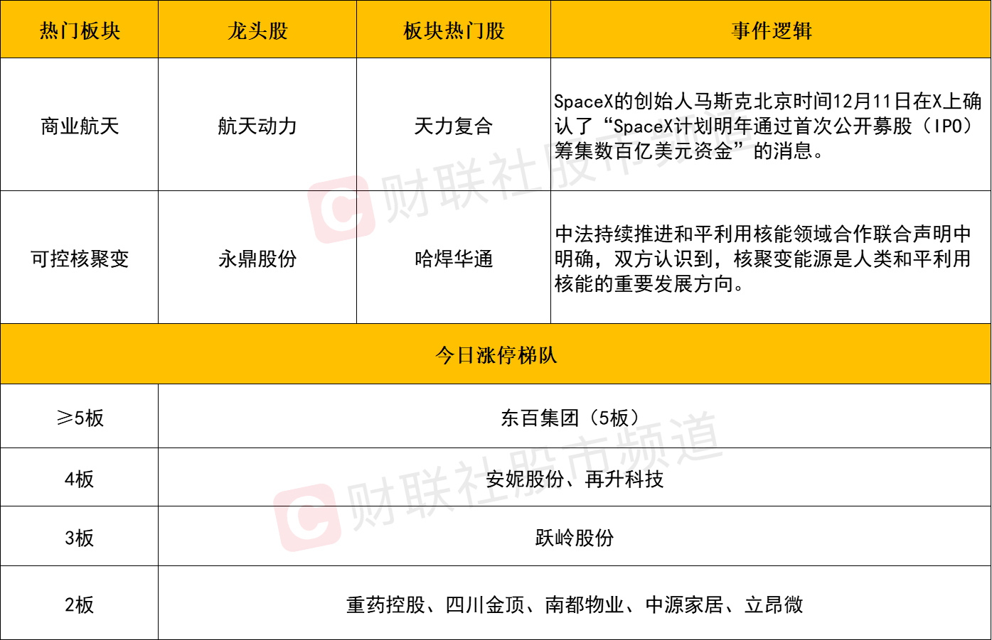 商业航天逆势走强,天力复合、通光线缆、航天动力、再升科技、银河电子、四川金顶、金风科技等个股涨停。消息面上,SpaceX的创始人马斯克北京时间12月11日在X上确认了“SpaceX计划明年通过首次公开募股(IPO)筹集数百亿美元资金”的消息。