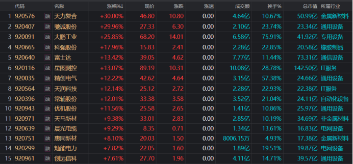 财联社12月11日讯(编辑 梓隆),今日(12月11日),北证50指数午后异动拉升,截至收盘,其全天收涨近3.84%,盘中一度涨超6%,创11月19日以来新高。具体个股方面,天力复合、驰诚股份双双获30cm涨停,大鹏工业、科强股份、富士达等股也涨幅居前。