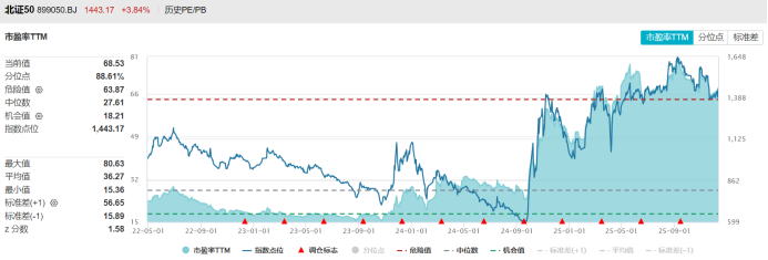 以估值层面统计,截至今日收盘,北证50指数目前市盈率68.53倍,处于上市以来88.61%分位点;市净率5.03倍,处于上市以来90.43%分位点。以历史数据统计,北证50指数曾于今年9月8日市盈率一度升至80.63倍,为历史最高纪录,而市净率则于今年9月16日达到历史最高点,为5.69倍。