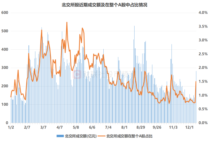 注:北交所股近期成交额及在整个A股中占比情况(截至12月11日收盘)