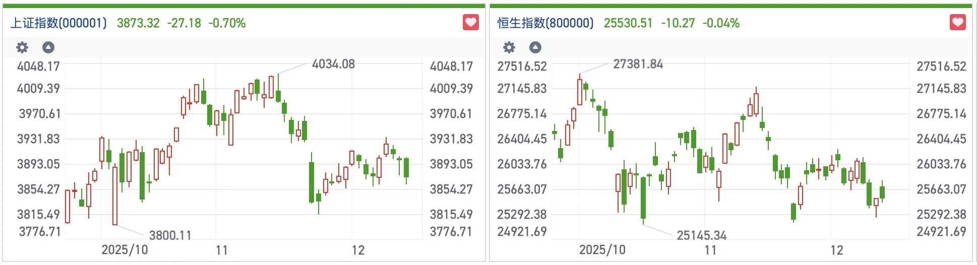 财联社12月11日讯(编辑 冯轶)港股今日延续震荡格局。截至收盘,恒生指数微幅下跌0.04%,国企指数跌0.23%,恒生科技指数收跌0.83%。