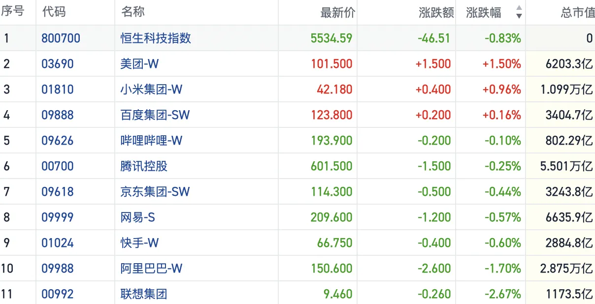 盘面上,今日大型科技股涨跌各异,其中,美团涨1.5%,小米、百度飘红,阿里巴巴跌1.7%,京东、腾讯小幅下跌。