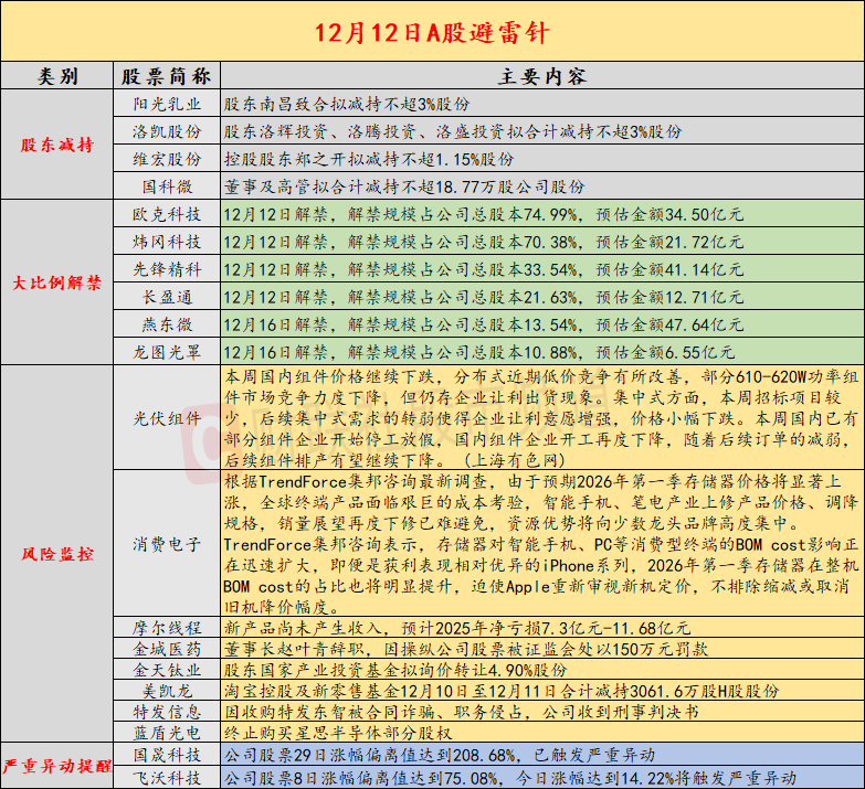 导读:财联社12月12日投资避雷针,近日,A股及海外市场潜在风险事件如下。国内经济信息方面包括:1)国内商品期市夜盘收盘多数下跌,能源品跌幅居前;2)本周国内组件价格继续下跌,后续排产或继续下降;公司方面重点关注包括:1)摩尔线程提示风险,新产品尚未产生收入,预计2025年净亏损7.3亿元-11.68亿元;2)金城医药董事长赵叶青辞职,因操纵公司股票被证监会处以150万元罚款;海外市场重点关注包括:1)美股三大指数收盘涨跌不一,大型科技股多数下跌;2)欧盟拟推迟燃油新车禁售令五年。