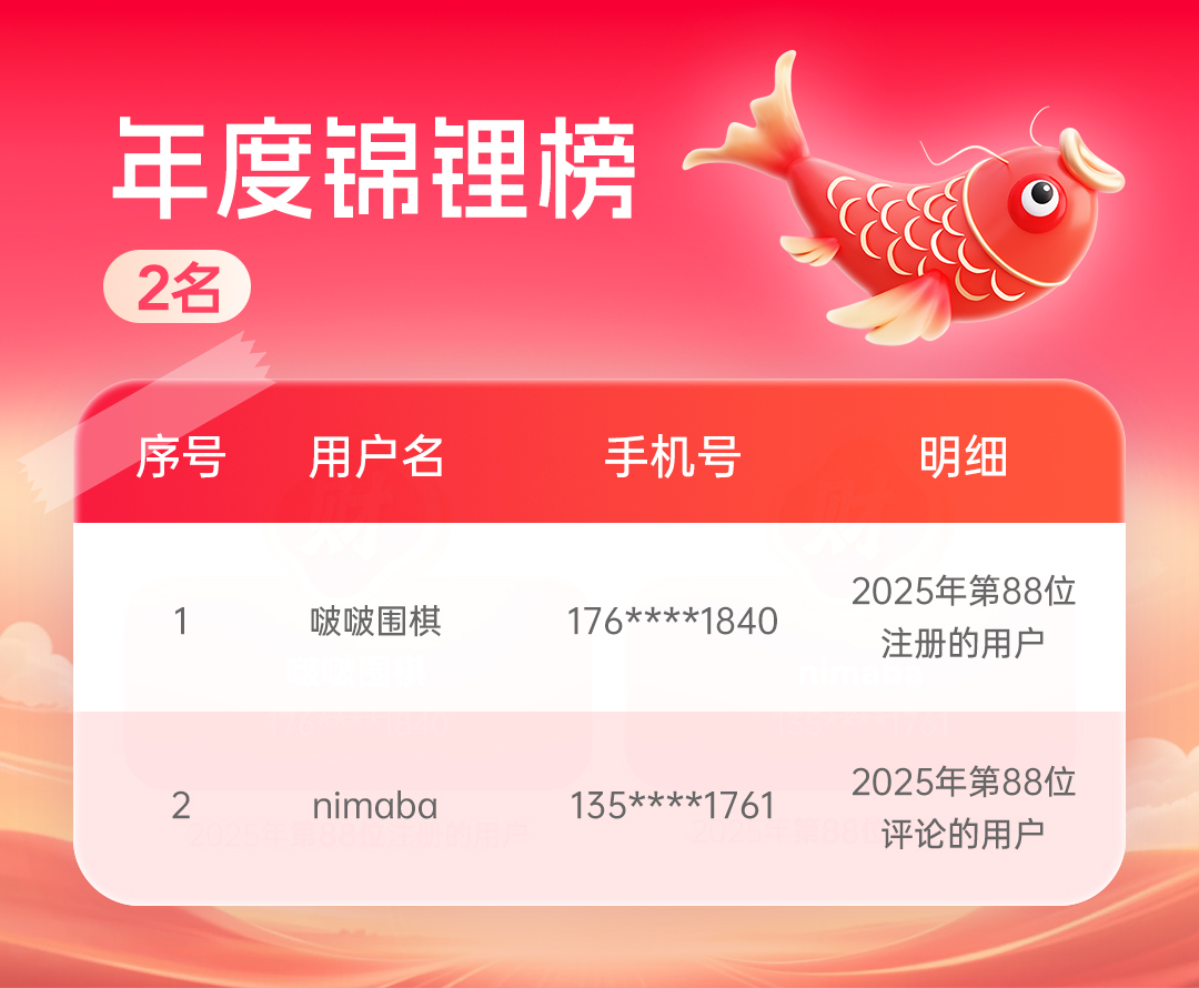 运气也是一种实力,有两位与年终告别应了景,当选年度锦鲤。一位2025年第88位注册,另一位2025年第88位评论。2026年,继续好运连连~