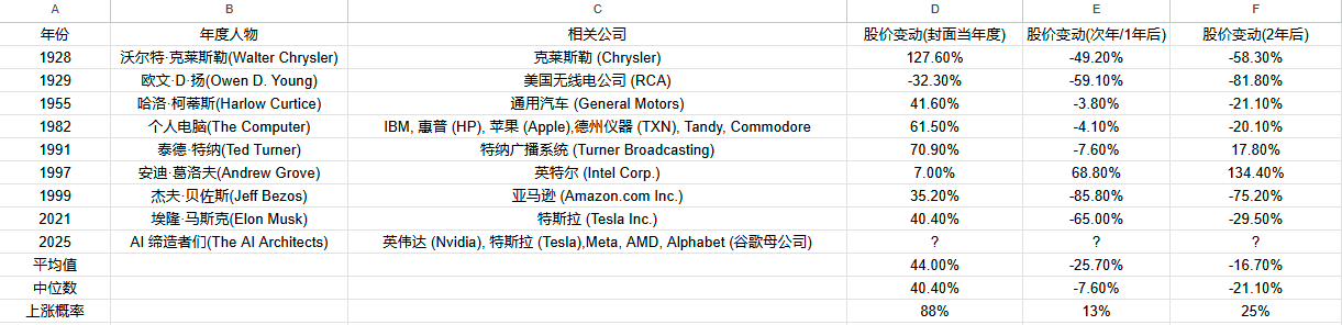 Spectra Markets总裁Brent Donnelly经数据分析也发现,《时代》年度人物作为投资反向指标的有效性非常显著。尽管《时代》周刊年度人物选定企业领袖或特定行业的样本量较小——Donnelly统计显示迄今仅有九次案例(含今年),但魔咒的成功率却令人惊讶。