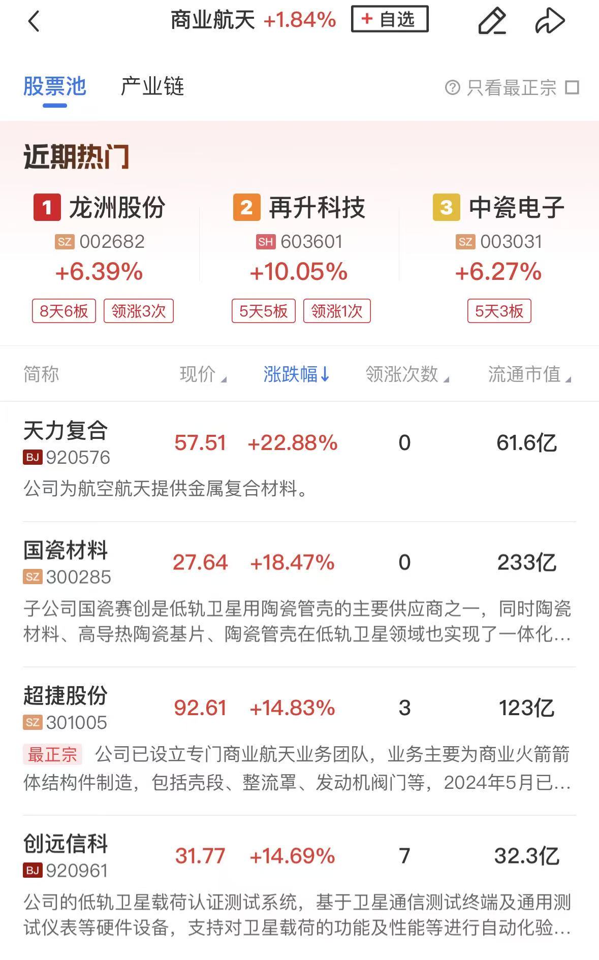 商业航天再度走强,再升科技、航天长峰、华菱线缆、四创电子、顺灏股份等个股涨停,天力复合、国瓷材料、超捷股份等个股涨幅居前。