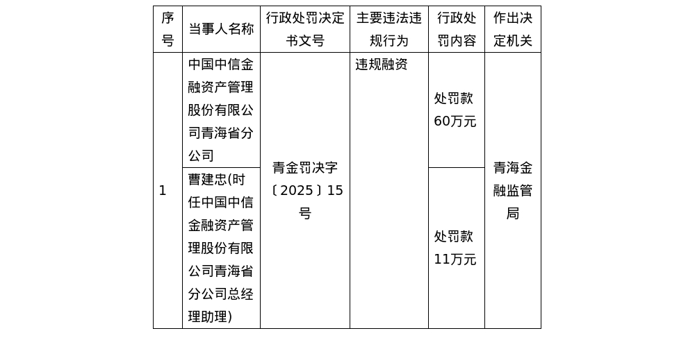 罚单显示,中信金融资产青海分公司的主要违法违规事实(案由)为:违规融资。