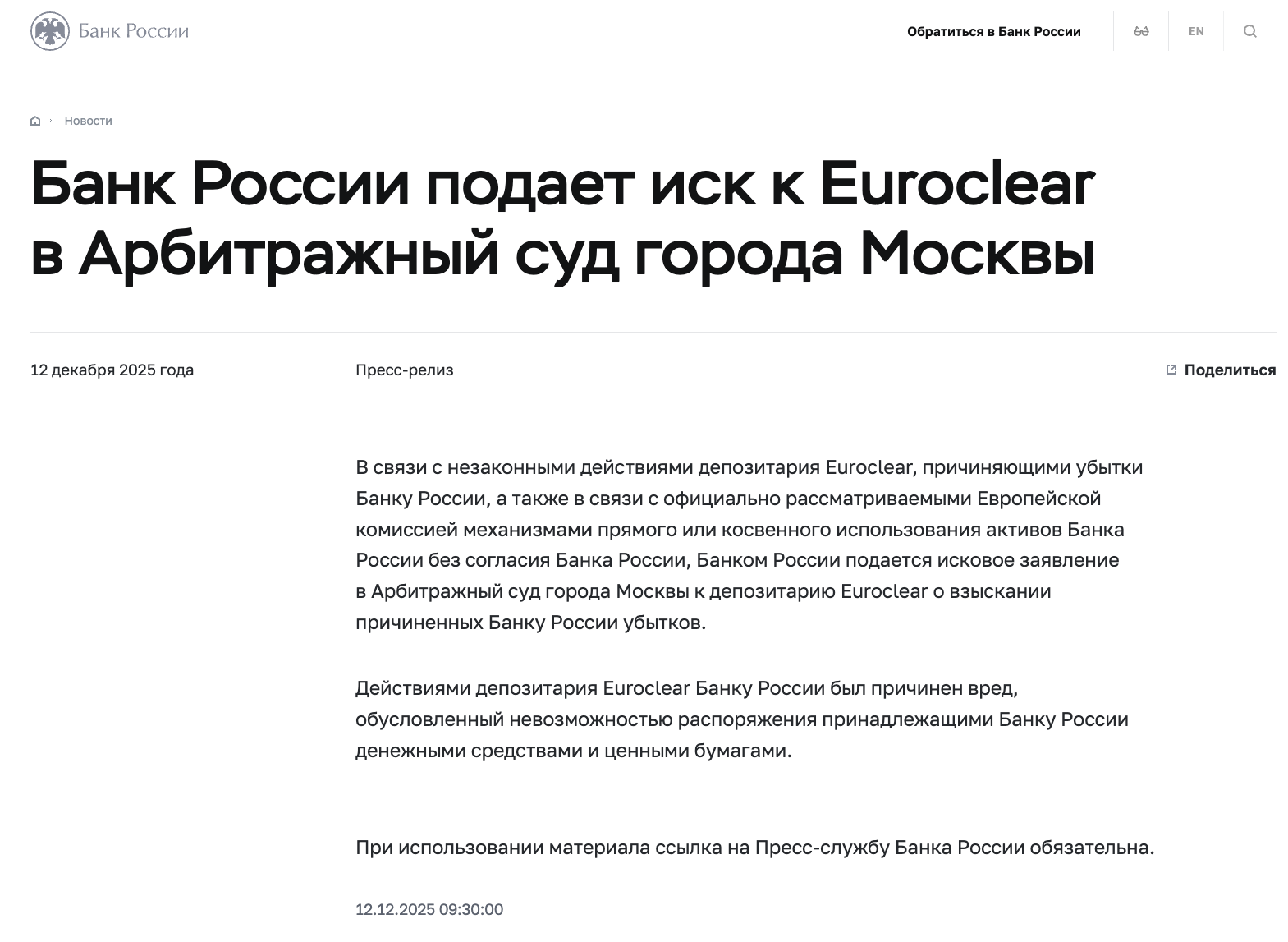 公告称:“鉴于存管机构欧洲清算银行的非法行为已给俄罗斯央行造成损失,同时鉴于欧盟委员会正在正式审议在未经俄罗斯央行同意的情况下,直接或间接使用俄罗斯央行资产的相关机制,俄罗斯央行已向莫斯科市仲裁法院对存管机构欧洲清算银行提起诉讼,要求其赔偿由此给俄罗斯央行造成的损失。”