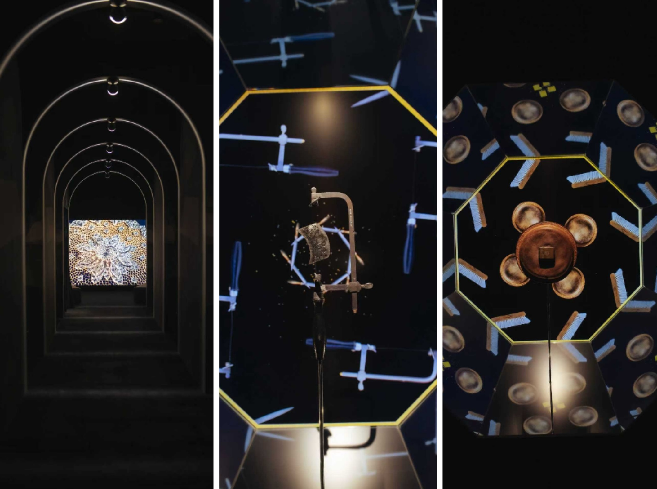 作为整场展览的终章,“典藏长廊”展厅四根中央立柱分别呈现品牌四大独特工艺的精髓:蕾丝镂空、“Honeycomb”蜂巢工艺、手工雕刻(包括“Rigato”“Telato”“Segrinato”“Ornato”以及“Modellato”五大独创技法)、连环成链。两侧立柱则汇集品牌创立至今最具标志性的作品系列,彰显布契拉提美学风格的延续与演进。