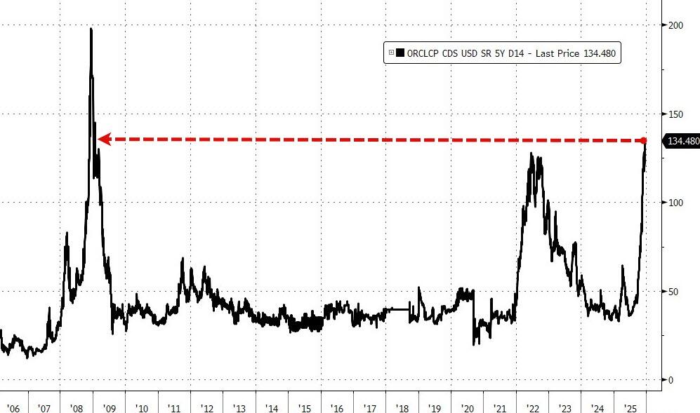 甲骨文债券遭遇的抛售,自然而然也进一步导致其CDS价差的飙升。甲骨文五年期CDS上周五一度最高上涨14.4个基点至151.3个基点,连续第二个交易日触及2009年全球金融危机期间以来的最高水平。
