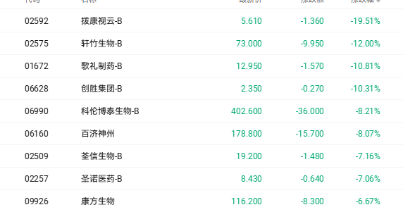 截至收盘,歌礼制药-B(01672.HK)跌10.81%、创胜集团(06628.HK)跌10.21%、科伦博泰生物-B(06990.HK)跌8.21%。