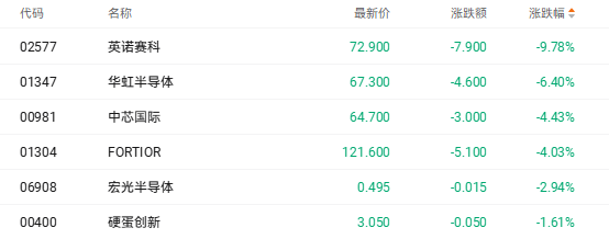 截至收盘,英诺赛科(02577.HK)跌9.78%、华虹半导体(01347.HK)跌6.40%、中芯国际(00981.HK)跌4.43%。