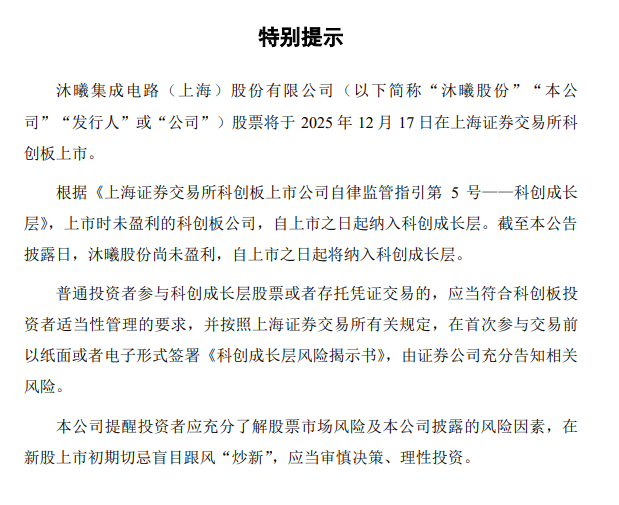 今日晚间,沐曦股份公告,公司股票将于2025年12月17日在上海证券交易所科创板上市。根据《上海证券交易所科创板上市公司自律监管指引第5号——科创成长层》,上市时未盈利的科创板公司,自上市之日起纳入科创成长层。