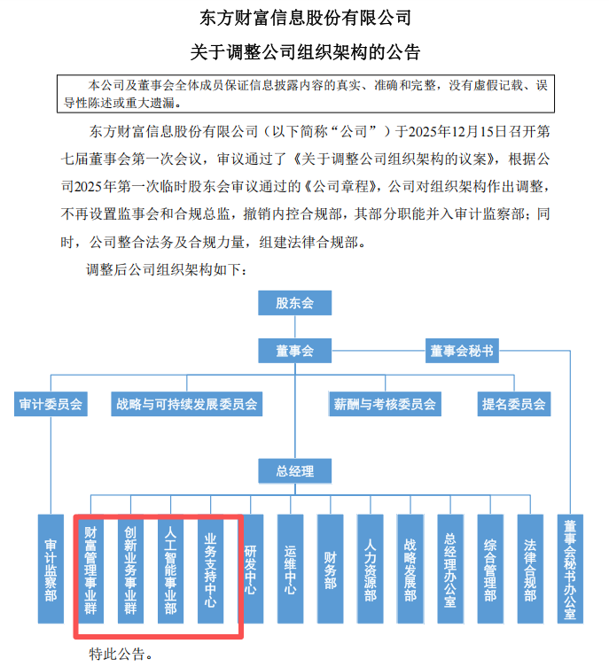 东方财富同日公告称,调整公司组织架构,不再设置监事会和合规总监,撤销内控合规部,其部分职能并入审计监察部;同时,公司整合法务及合规力量,组建法律合规部。