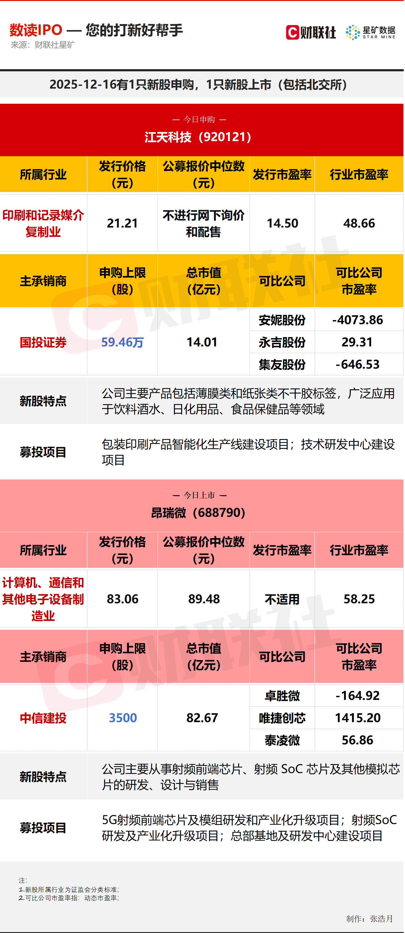财联社12月16日讯,今日有1只新股申购,为北交所的江天科技;1只新股上市,为科创板的昂瑞微。