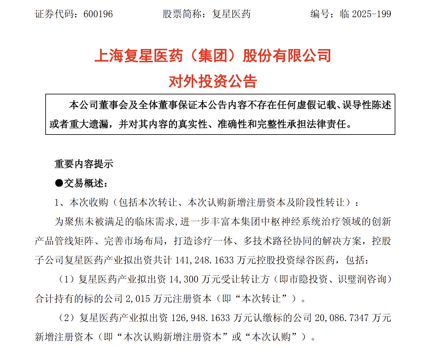 斥资14.12亿元!复星医药控股绿谷医药 “九期一”投入已超40亿元