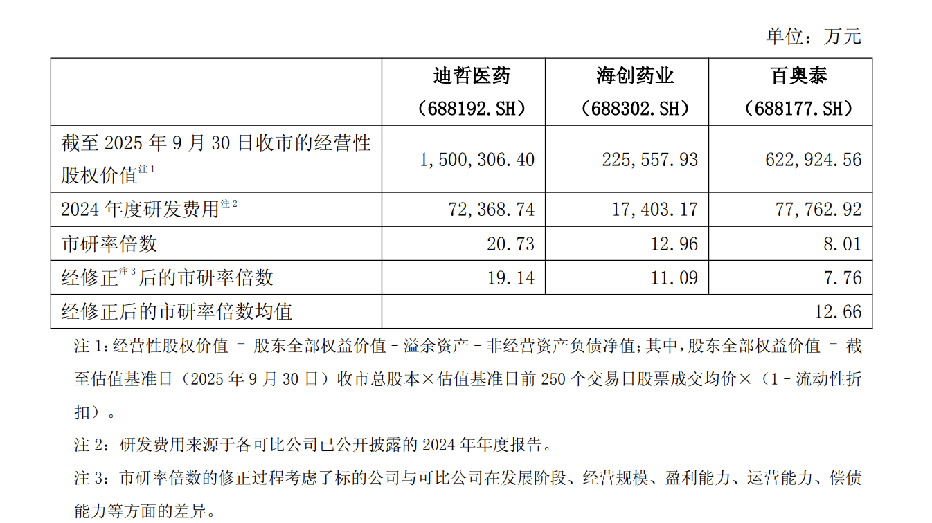 此外,公告显示,本次交易估值参考上海东洲资产评估有限公司出具的《估值报告》,截至2025年9月30日,绿谷医药股东全部权益价值估值为16.74亿元。估值选取市研率倍数(股权价值/研发费用)作为确定绿谷医药股权价值的分析指标。具体而言,通过选取迪哲医药(688192.SH)、海创药业(688302.SH)、百奥泰(688177.SH)等可比上市公司,以经修正后的市研率倍数均值12.66倍为核心指标计算得出。