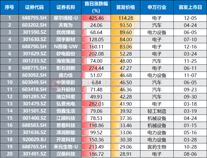 近期,新股市场继续保持活跃,截至今日收盘,月内(12月)上市的5只新股平均首日涨幅近268.6%,在年内各月份中位居第三位,仅低于11月(327.6%)、7月(280.4%)。具体个股来看,摩尔线程首日涨幅425.46%,在月内新股中涨幅居首,精创电气、中国铀业、昂瑞微、百奥赛图4股首日则分别上涨近330.74%、280.04%、160.11%、146.63%。