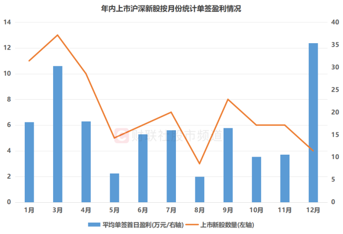 ③从沪深新股打新盈利上看,受摩尔线程影响,12月新股平均首日单签盈利8.86万元,在各月份中位居第一。