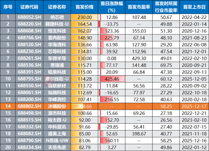 注:年内上市新股发行价排行榜(截至12月16日收盘)