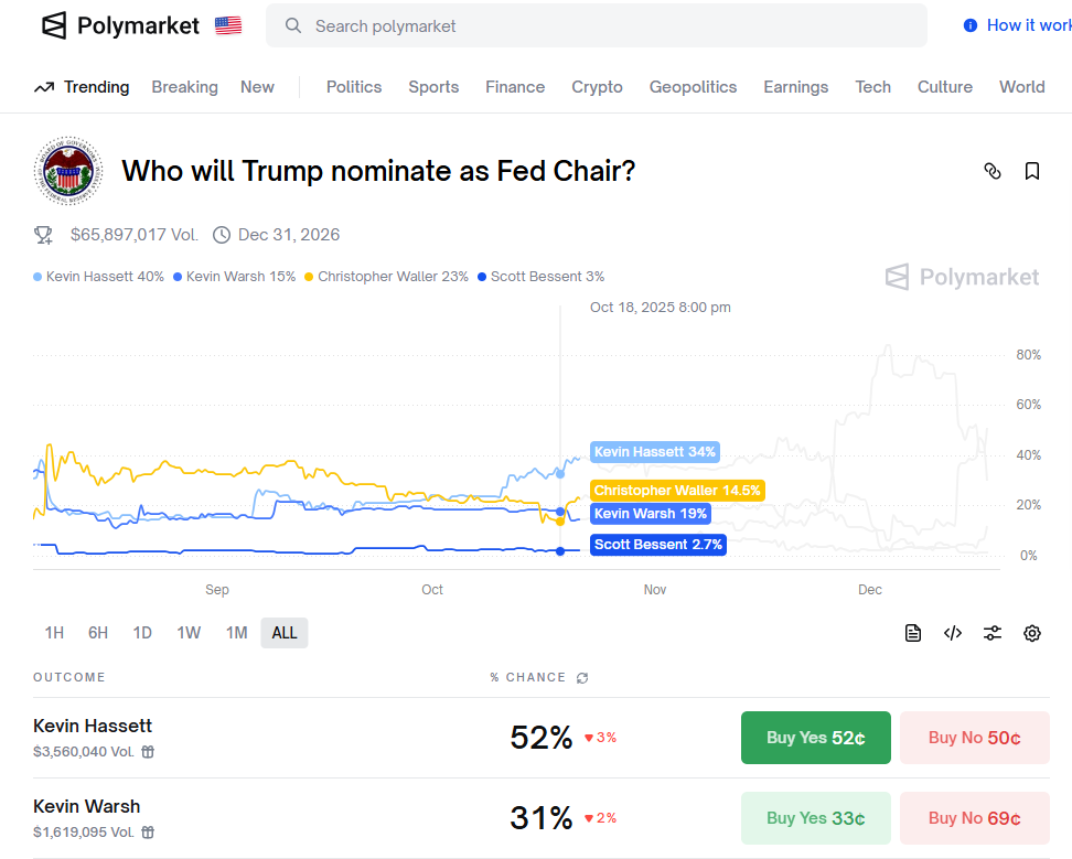 尽管在特朗普上周末的一番表态后,另一位热门人选,美联储前理事凯文·沃什(Kevin Warsh)被提名为美联储主席的概率大幅上升,但在全球最大“预测市场”平台Polymarket上,哈塞特仍稳居榜首。