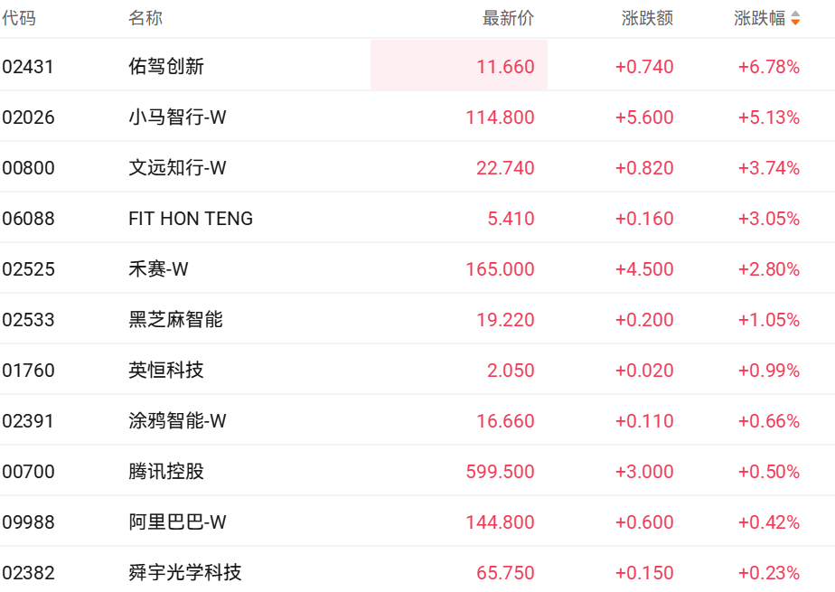 截至发稿,佑驾创新(02431.HK)涨6.78%、小马智行-W(02026.HK)涨5.13%、文远知行-W(00800.HK)涨3.74%、禾赛-W(02525.HK) 涨2.80%。
