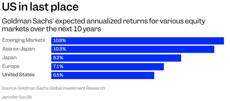 在上个月给客户的一份报告中,高盛表示,它认为与全球其他市场相比,美国市场在未来十年的回报率将会是全球最差的。