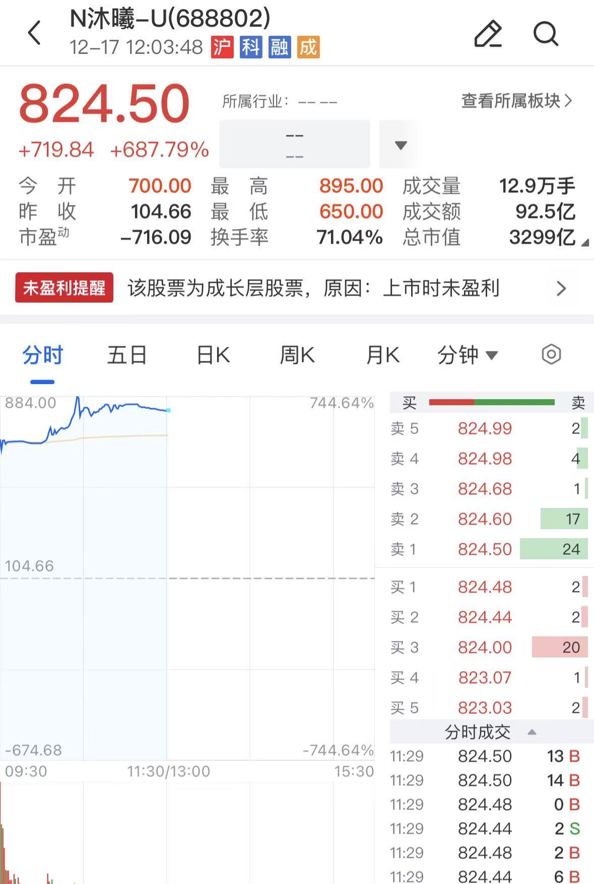 沐曦股份今日登陆上交所科创板,发行价为104.66元/股。上市首日股价大幅高开,盘中最高涨幅超过700%,触及895元,最终收报824.5元,较发行价上涨687.8%,理论上一签最高或可盈利39.5万元,超越日前上市的摩尔线程,成为A股全面注册制以来最赚钱新股。