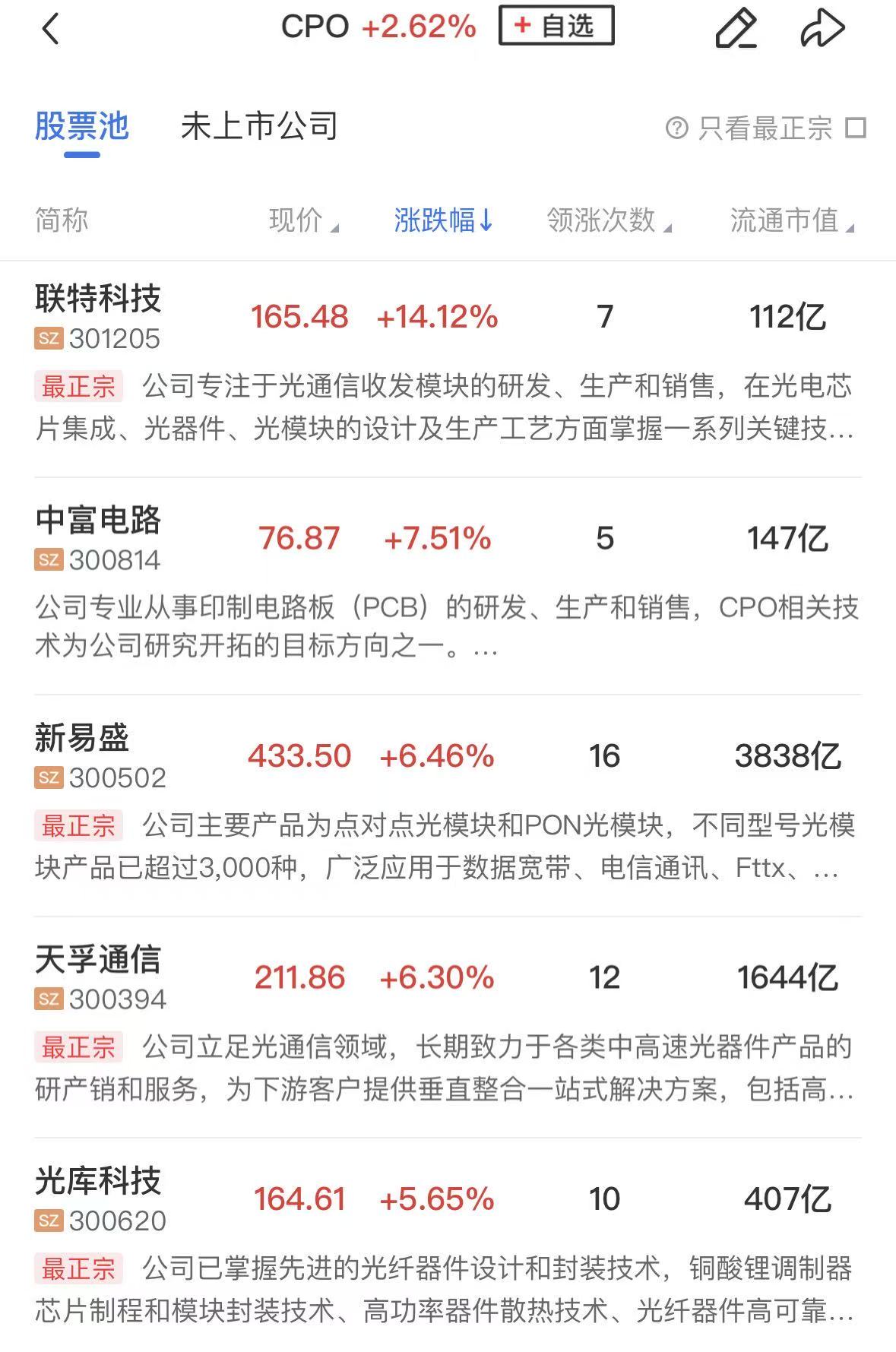 板块上,以CPO为代表的算力硬件股展开反弹,长飞光纤、环旭电子涨停,中富电路、天孚通信、新易盛、生益电子、中际旭创等同样表现活跃。
