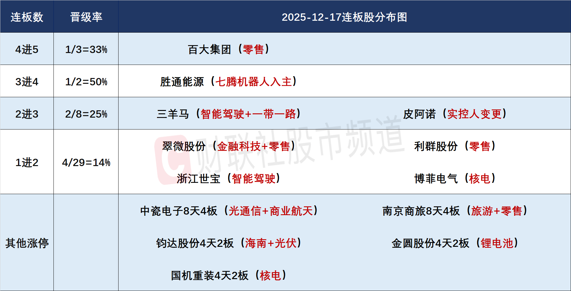 中央财办有关负责同志表示,扩大内需是明年排在首位的重点任务,明年要把握消费的结构性变化,从供需两侧发力提振消费。尽管安记食品、皇氏集团等前期领涨的高位股表现承压,但零售股百大集团、利群股份仍双双实现连板晋级。此外受益元旦小长假入住热门城市酒店订单量同比增长3倍以上的消息刺激,曲江文旅、三峡旅游两股盘中一度触及涨停。此前文章多次提及,受益元旦春节双旺季临近,历年大消费板块仍容易成为涌现人气股的温床,不过与以往不同的是,此前大消费板块已经经历几次催化,包括海欣食品等叠加福建板块的人气股已经层出不穷,未来整个大消费板块或难以出现更强催化,其与科技等成长赛道负相关走势仍将成为常态。