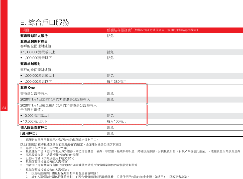 其中,作为香港本土最大的商业银行,汇丰银行计划从2026年1月1日起,针对新开户的内地居民三个月平均账户资产总值不足1万港元的汇丰One账户将收取每月100港元的服务费,更是引发市场关注。