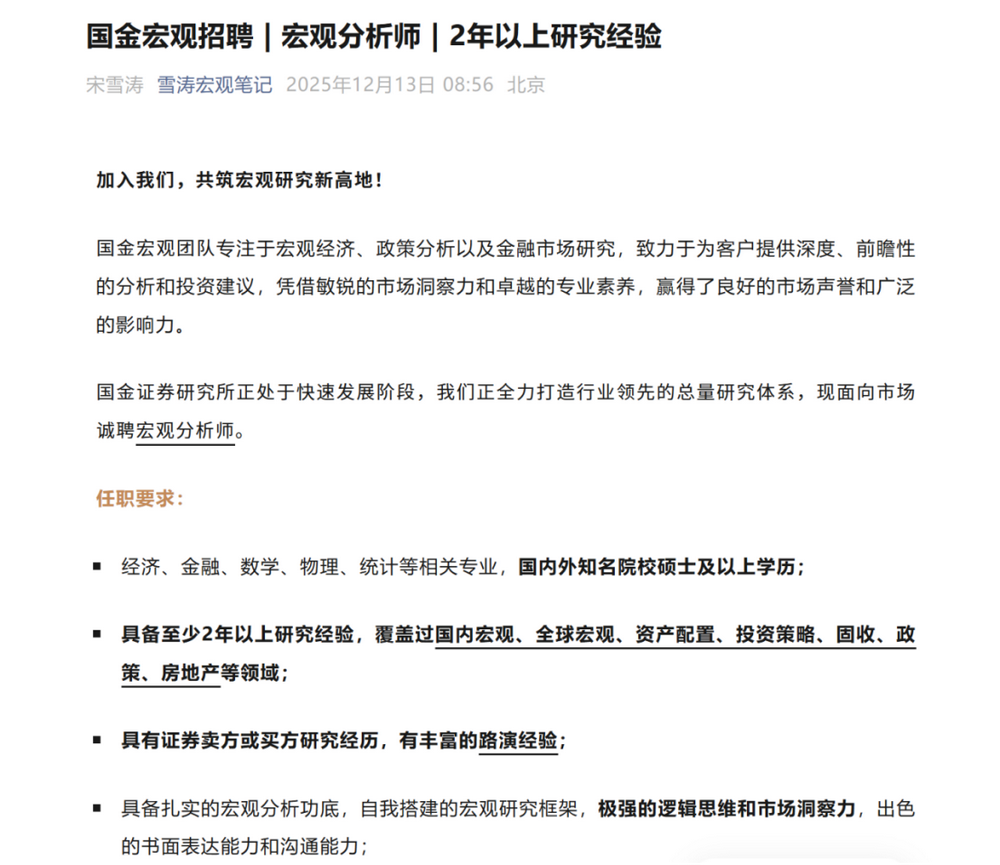 值得注意的是,今年以来已有多位资深分析师加盟的国金证券,仍在持续扩充研究团队。近日,国金证券首席经济学家宋雪涛通过微信公众号发布宏观分析师招聘启事,明确指出当前国金证券研究所正处于快速发展阶段,正全力打造行业领先的总量研究体系,现面向市场诚聘具备扎实研究功底的宏观领域人才。