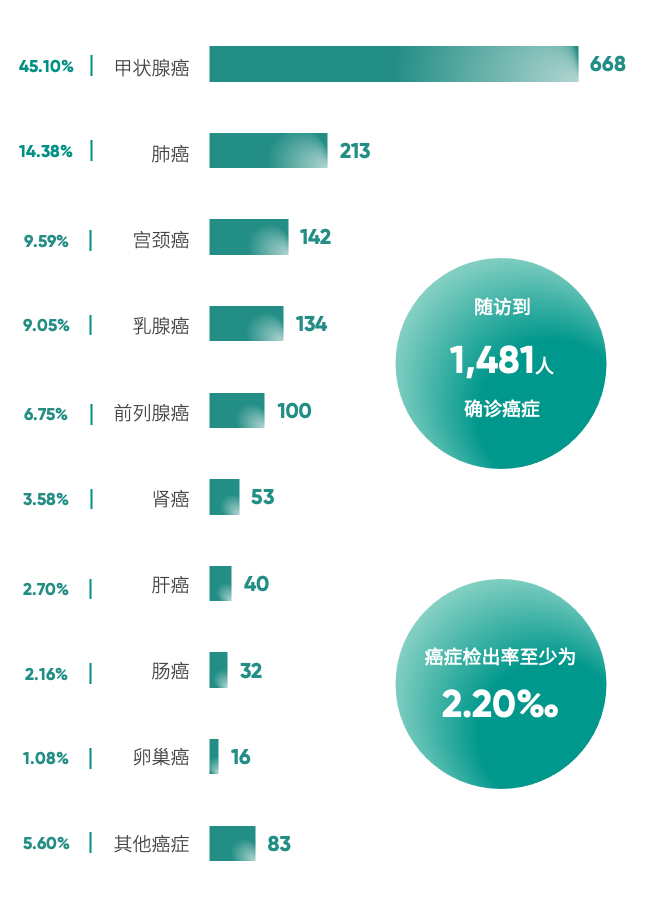 在随访到的癌症患者中,甲状腺癌确诊人数最多,高达668人,往下依次是肺癌、宫颈癌、乳腺癌、前列腺癌等。